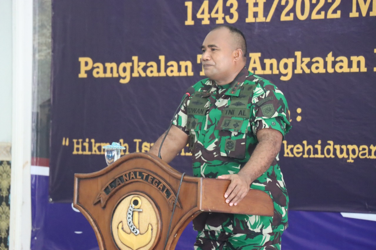 Komandan Lanal Tegal dalam sambutannya menyampaikan bahwa Peristiwa Isra Mi'raj mengandung hikmah relevan dalam kehidupan kita dewasa ini dan kehidupan bermasyarakat berbangsa dan bernegara. “Pada kesempatan ini saya mengajak kepada seluruh keluarga besar Lanal Tegal untuk mengimplementasikan konsep pembangunan Indonesia sebagai negara berketuhanan, negara religius yang terbebas dari kemiskinan dan menjadi sebuah negara yang adil makmur Sejahtera'', Ucap Danlanal.