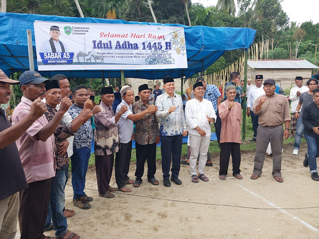 Bupati Pasaman Sabar AS (berpidato), Wali Nagari Panti Selatan Didi Al Amin, Anggota DPRD Pasaman H. Mulyadi, Sekretaris DPC Demokrat Pasaman Harisuddin, anggota DPRD Pasaman terpilih Apir, dan pengurus DPC Demokrat Pasaman Ratnawilis saat kegiatan kurban Demokrat di Kampung Air Rambah, Nagari Panti Selatan, Selasa (18/6/2024).